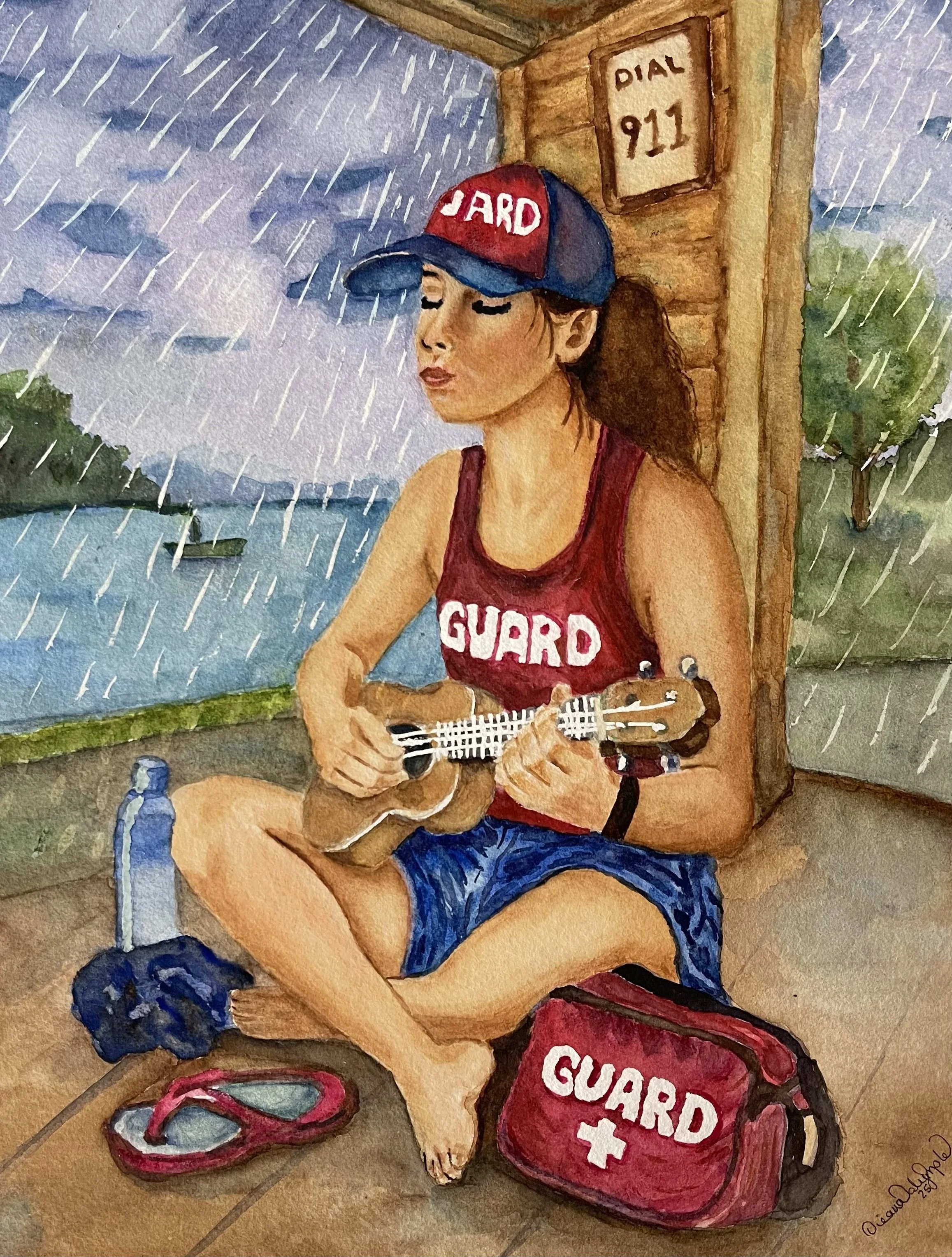 This piece was inspired by my daughter during her summers as a lifeguard. On stormy days, when the beach was empty and the skies turned gray, she would sit under the shelter with her ukulele, singing, strumming, and finding calm in the chaos. That quiet moment of resilience and beauty is what I hoped to capture in this watercolor.