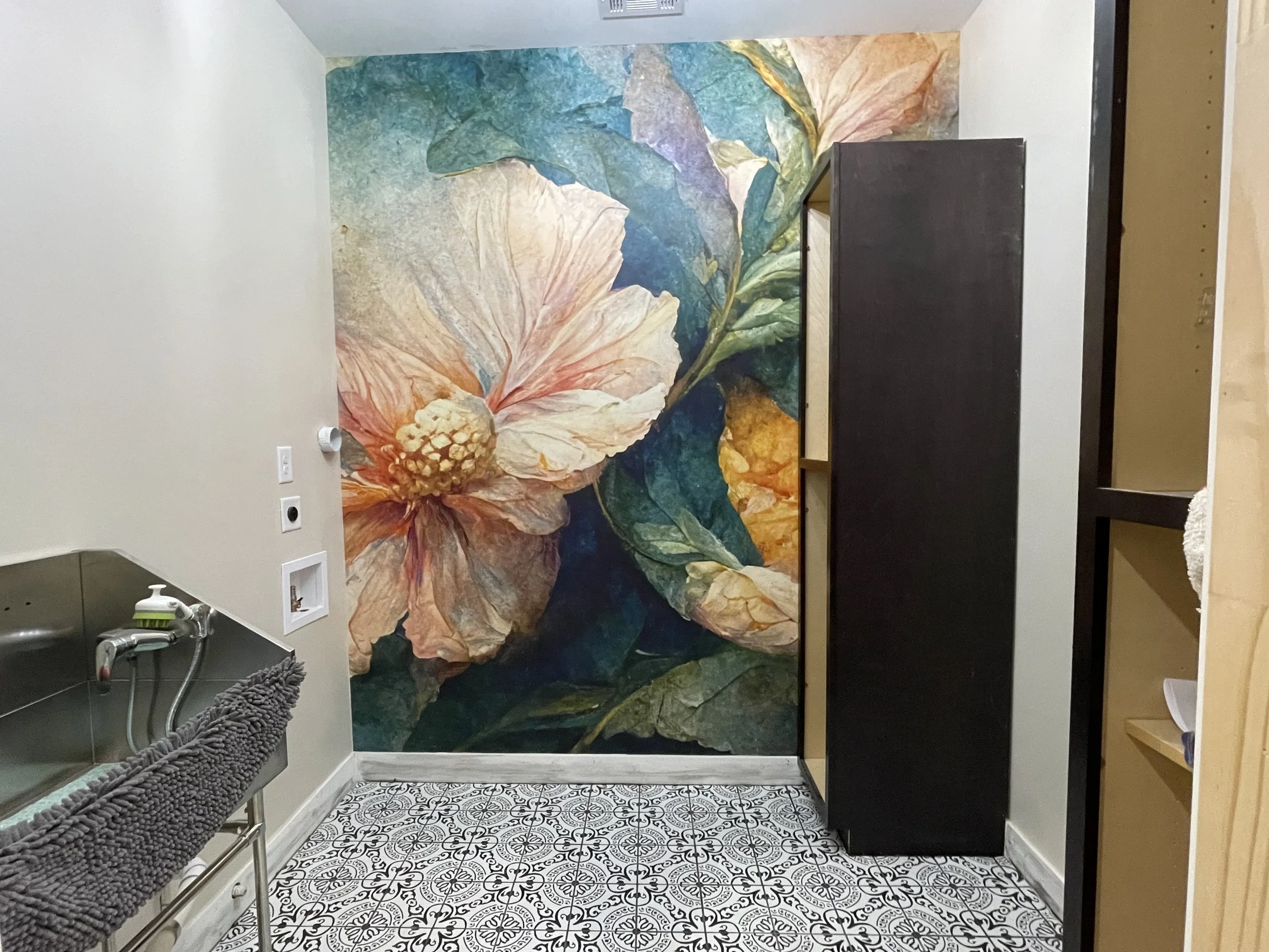Wallpaper murals aren’t just for living rooms or bedrooms, they can brighten up unexpected spaces too. I recently installed this bold floral mural in a laundry room that doubles as a dog spa, instantly turning it into a space that feels fun and uplifting.